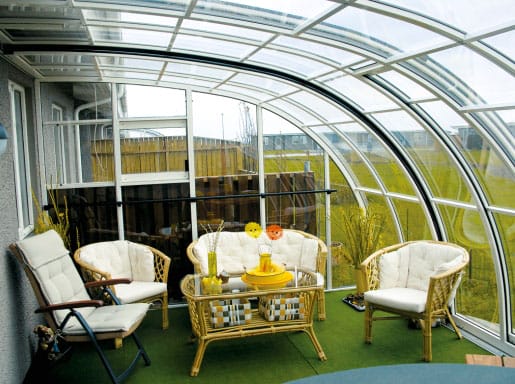 Легкой, солнечной и воздушной выглядит летняя веранда при использовании в ней современного безрамного остекления.