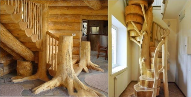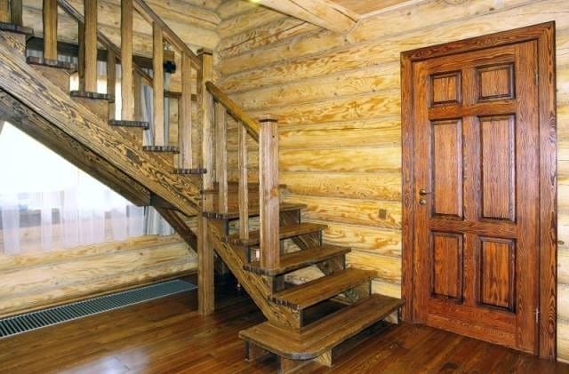 В доме из сруба можно поставить не обычную деревянную лестницу, а сооружение в стиле кантри. В этом решении сочетается безопасность, удобство и яркая эстетическая нагрузка.