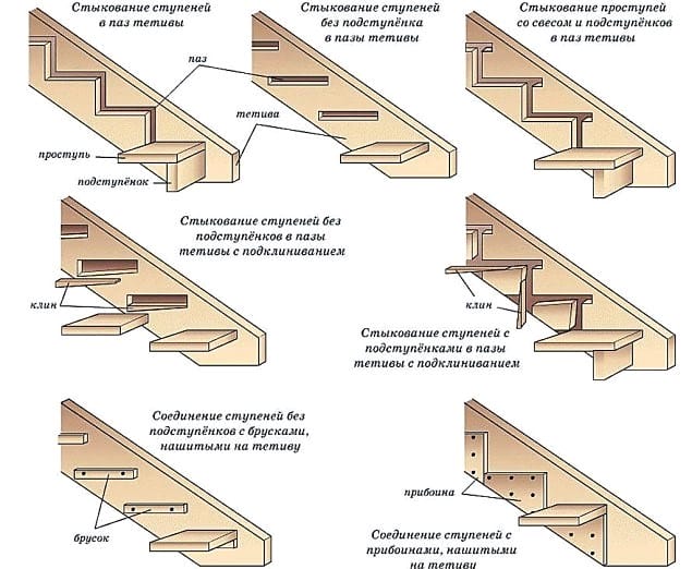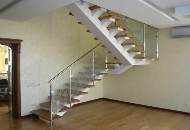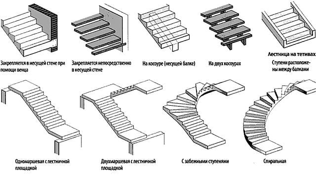 - на косоурах (крепление к нижней цельной балке): прямые, ломаные, винтовые;