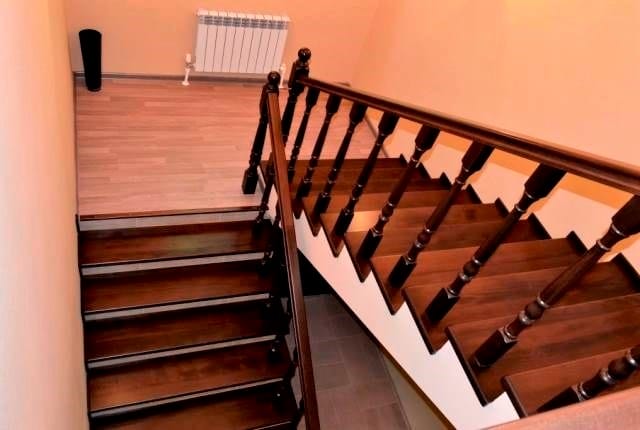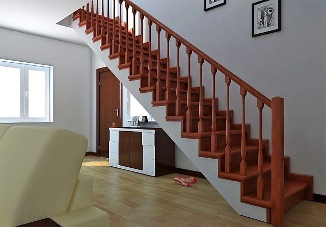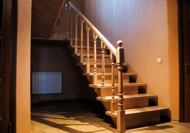 Схожий вариант для небольшого дома с невысокими потолками — открытая деревянная конструкция на двух косоурах. Такой вариант универсален и недорог.
