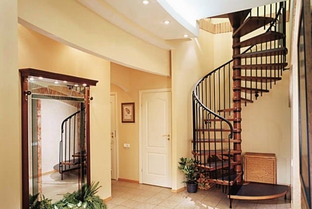 Для небольшой прихожей в приоритете будут пристенные поворотные и винтовые варианты. Если мало места, то обустройство лестницы на второй этаж выполняется в стиле минимализма. Такой подход не утяжелит интерьер и визуально сохранит простор. Неуместно в тесной прихожей смотрится тяжелая кованая конструкция.