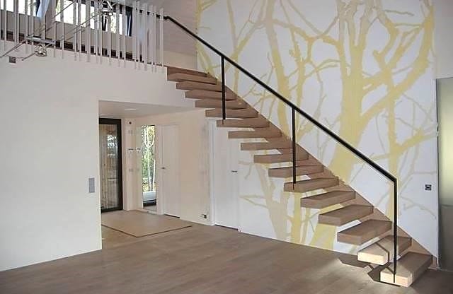 Открытая конструкция на металлических ломанных косоурах дополнит современный интерьер. Отсутствие поручней облегчает конструкцию, но делает подъем небезопасным.