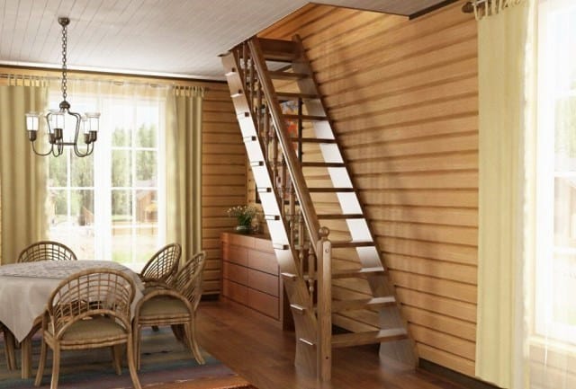 Деревянные лестницы не обязательно выглядят массивно. Простая конструкция на тетивах занимает минимум места и уместна в дачном доме. К недостатку можно отнести слишком крутой подъем в сочетании с открытыми ступенями.
