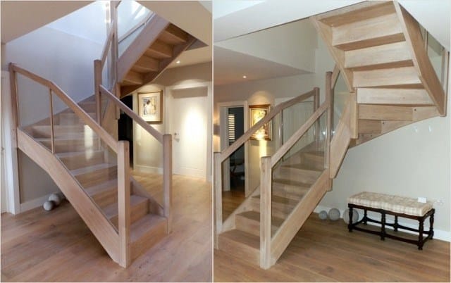 Деревянная поворотная лестница на тетивах со стеклянными перилами выглядит элегантно и сдержанно. Она не выделяется, но привлекает внимание своей скромностью. Отлично подойдет для современного интерьера.