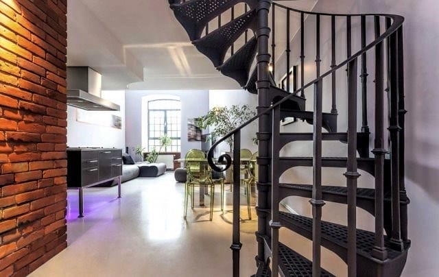 В подобном настроении можно создать и винтовую конструкцию. Несмотря на то что вариант хорошо вписывается в современный интерьер, гораздо гармоничнее лестница смотрелась бы в помещении с открытыми деревянными стенами.
