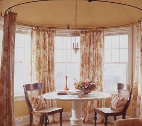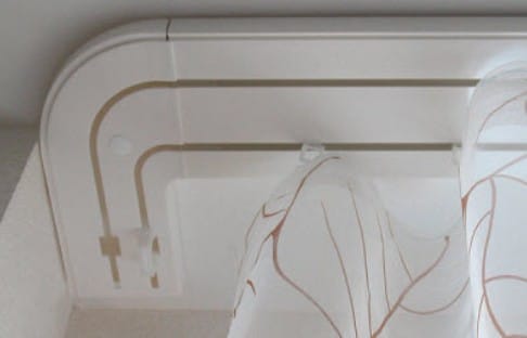 Для эркерных окон существуют радиусные (гибкие) и угловые системы карнизов. С помощью таких систем можно оформить портьерами арки дверных проемов и закрепить балдахин над кроватью.