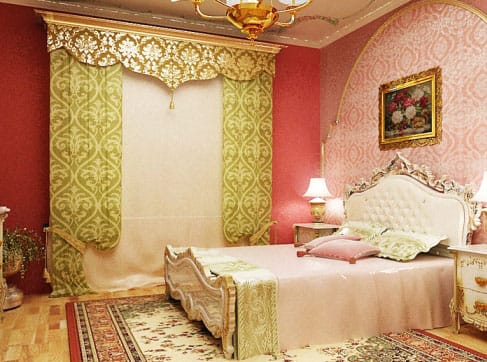 Восточный (арабский) интерьер – роскошный и уютный – это струящая ткань с восточными растительными или геометрическими мотивами той или иной страны в сочетании с бархатом, шелком, парчой красных, синих, оранжевых оттенков с золотой нитью. В оформлении штор используют золотистую тесьму, бахрому и кисти.