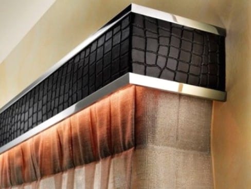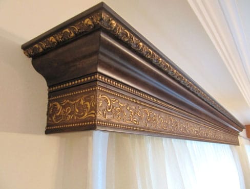 Если спрятать шторы в нишу не удается, то скрыть крепления можно при помощи багетного карниза. Багет инкрустируется деревянной резьбой в сочетании с позолотой, выполняется с имитацией кожи, мрамора, ткани и других материалов либо шпонируется различными породами дерева.