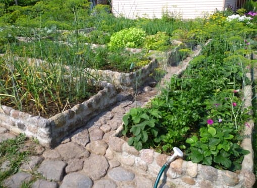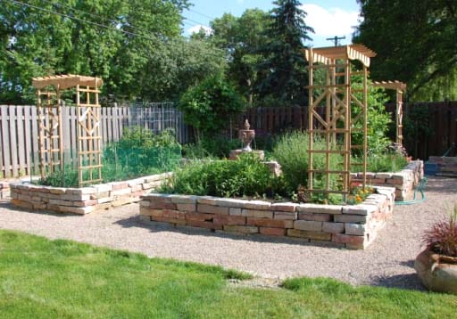 Этот строительный материал превратит огород в композицию, состоящую из овощных клумб. Правда вырастут и затраты на создание таких грядок. Для их сооружения понадобится кирпич или камень, цементный раствор и свободное время. Ну и самое главное – ваша фантазия, ведь вариантов кладки может быть много.