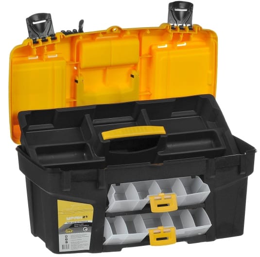 Тем, кто пользуется не только мелким ручным, но и более крупным электрифицированным инструментом, наверняка понравится модель со съемными перегородками. Убрав их, можно значительно увеличить внутренний объем бокса.