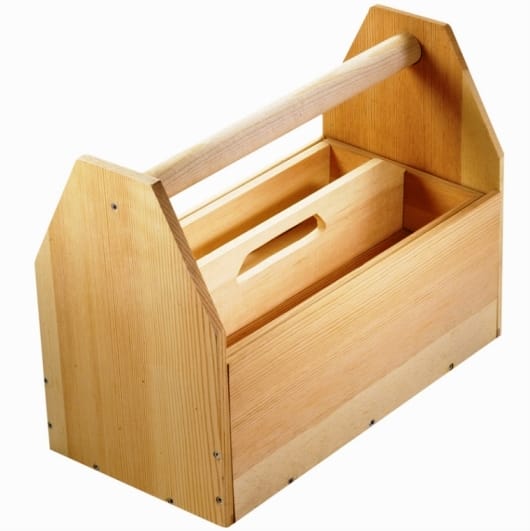 Для ее изготовления можно воспользоваться тонкой доской, фанерой или OSB плитой. Вырезав по шаблону два торца с отверстиями для ручки, к ним саморезами прикручивают боковые стенки и дно. После этого внутри ставится одна или две перегородки. Их высоту нужно выбрать такой, чтобы сверху осталось место для установки неглубокого деревянного или металлического ящичка, в котором будет храниться мелкий крепеж.